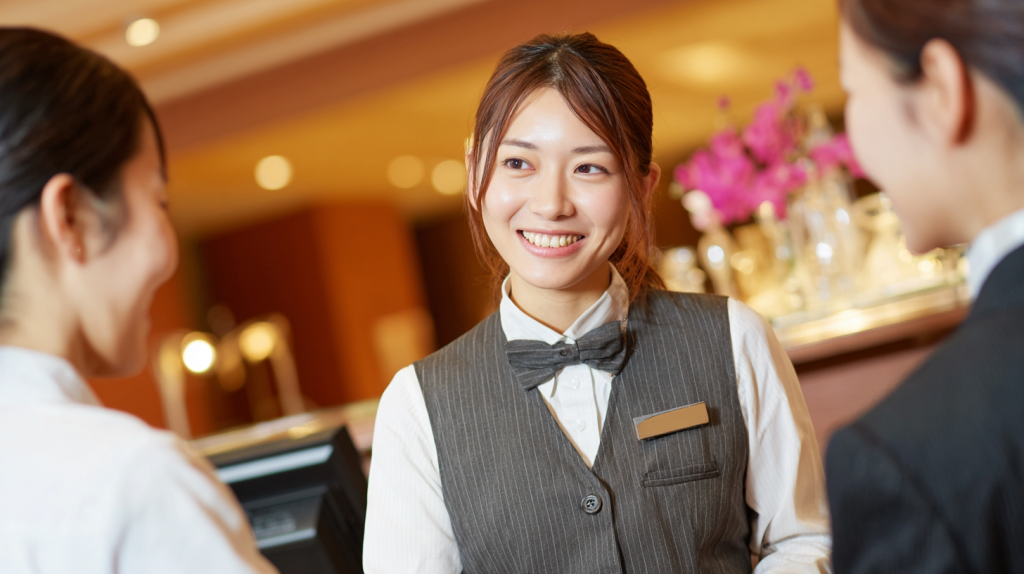A:接客はサービス業です。私たちは製造業ではなく情報処理サービス業ですから、直接お客様と向き合い、良い気分にさせるスキルは欠かせません。プロデューサーやディレクター、プロマネ、上級SEになるためにも必要な能力です。さらに、外国人のお客様も多く来場するので、英語でのコミュニケーション力を磨く良い機会にもなります。